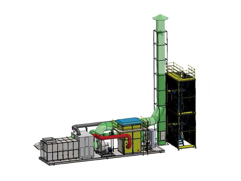 脱附产生的浓缩废气在进入催化床层之前,与高温烟气首先在換热器单元进行換热,预热脱附废气并进入催化床。脫附气体在催化床内升至300℃,进行催化氧化反应,有机成分被氧化成无毒无害的CO2和H2O,并放出热量。形成的烟气(<650℃)在排出时与进气进行換热后,达标排放。