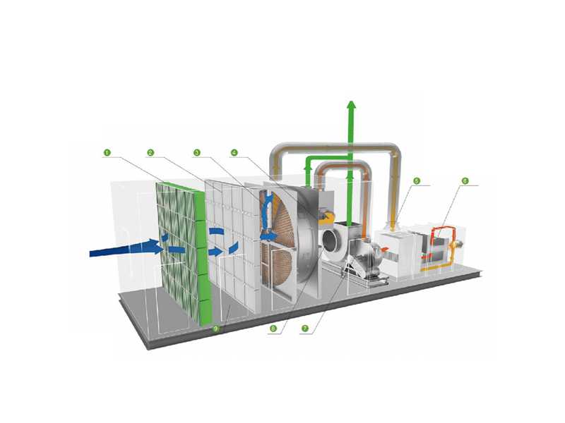 经预处理(去除粉尘、颗粒物)后的有机废气流过浓缩转轮时,其中的有机物在转轮吸附区域会被吸附下来,经过吸附净化后的废气(约占处理风量的85% 95%)排放到大气中,一小部分废气(约占处理风量的5%~15%)对转轮冷却区降温后经換热器被加热到180 220℃的脫附温度后,流入脱附区,脫附区有机物从吸附剂一沸石上脫离到加热的气流中,转轮得以再生,脫附后的高浓度VOCs被送入CO催化燃烧。